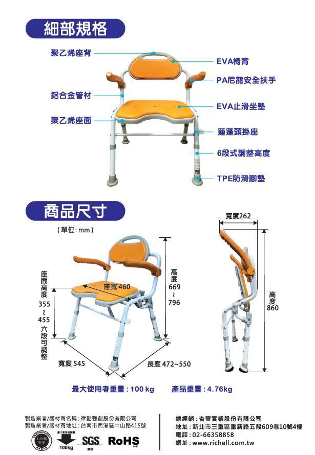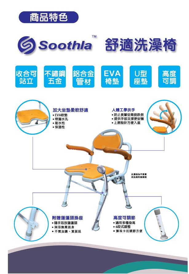 椅腳.座墊.背墊.扶手與身體接觸具有防滑設計,提高安全性,扶手可收折.